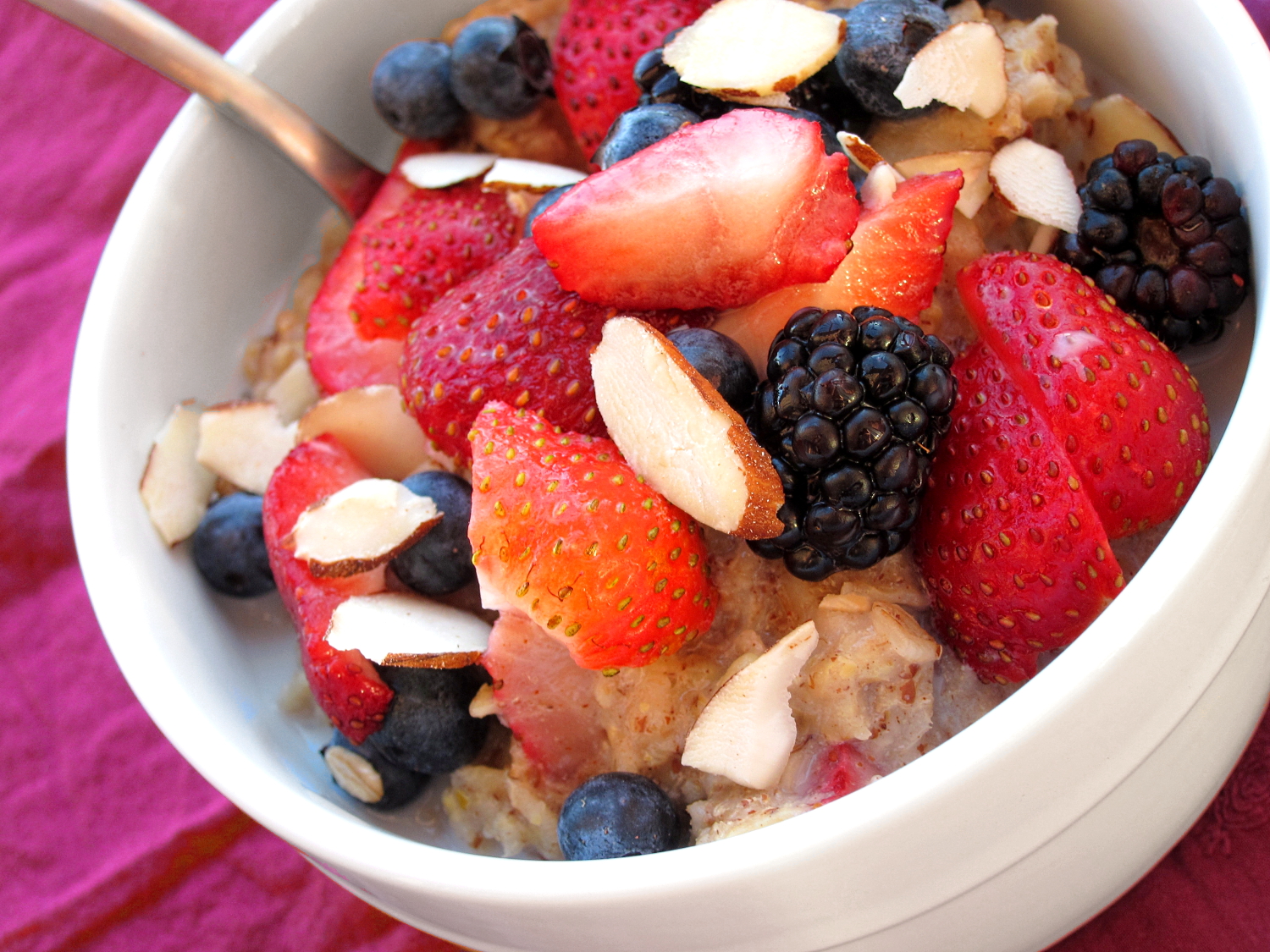 - When you're pleased with the consistency of the oatmeal, add half of the fruits and stir gently. Transfer to a bowl and top with the rest of the fruit. Serve with another splash of your milk of choice and any other additional toppings (shredded coconut, nuts, etc.).